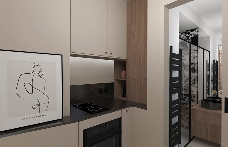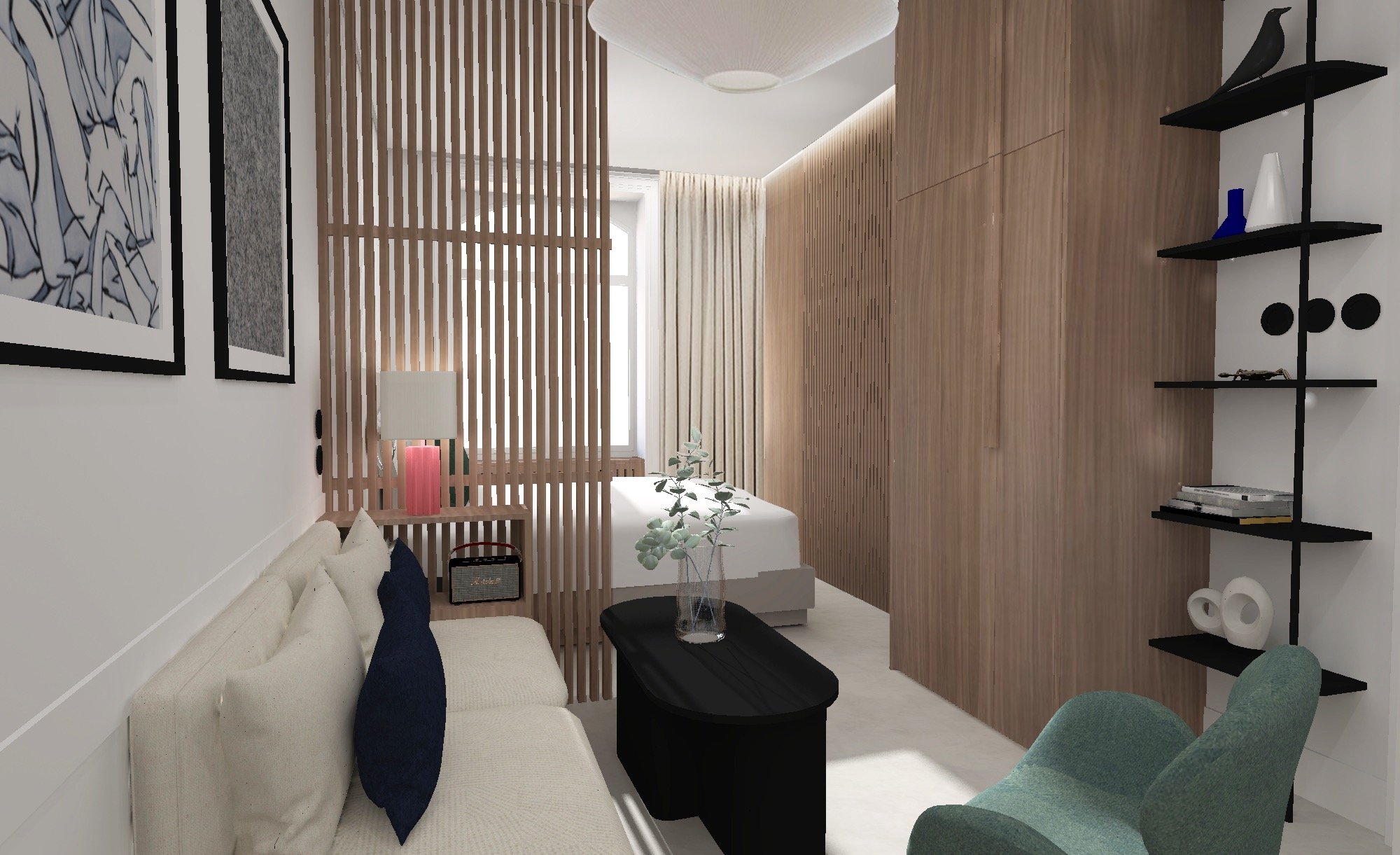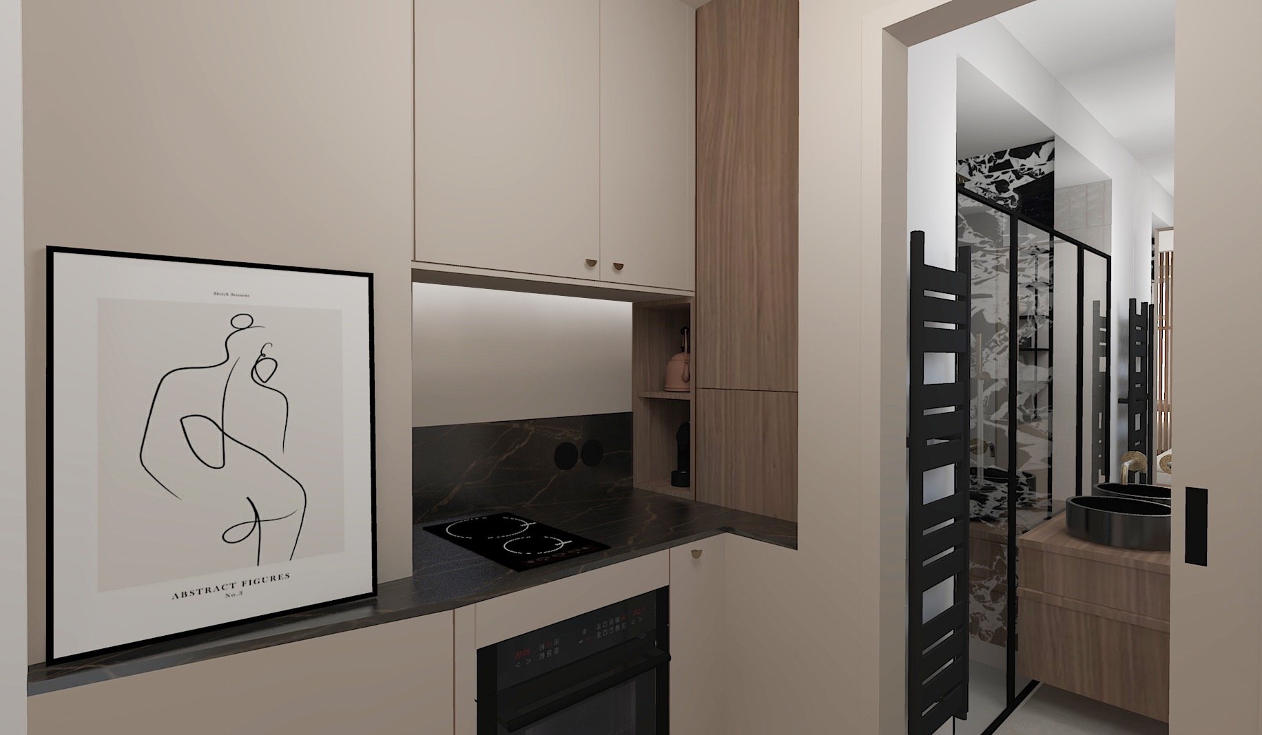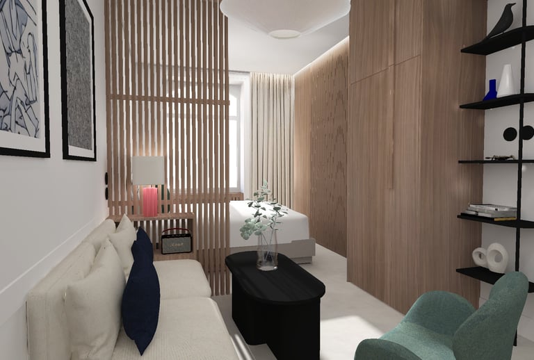 Fonctionnel et cocooning, ce studio emprunte les codes chics des suites d’hotels pour se transformer en havre de douceur. L'aménagement ayant été travaillé en majeure partie sur mesures, rien n'est laissé au hasard et chaque recoin est utilisé de manière adéquate pour un gain de place et une optimisation de l'espace.
