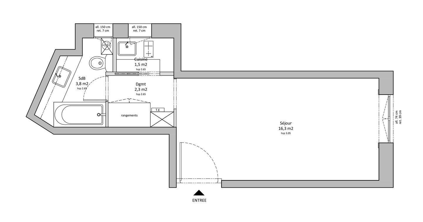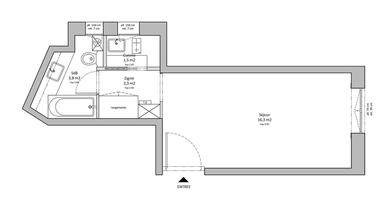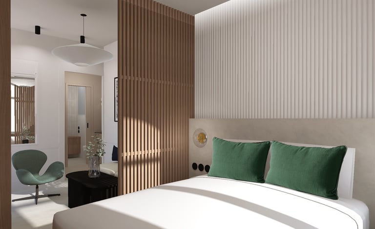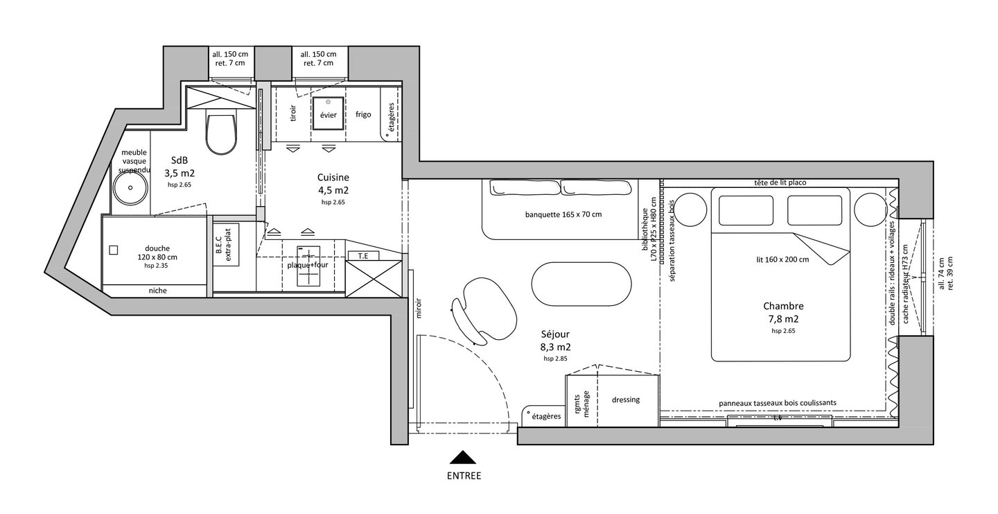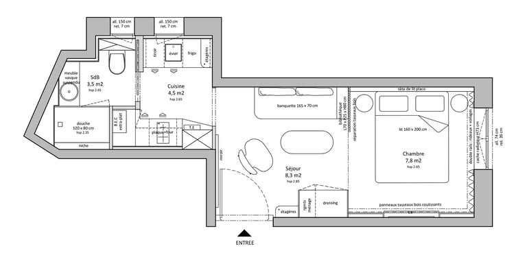 Fonctionnel et cocooning, ce studio emprunte les codes chics des suites d’hotels pour se transformer en havre de douceur. L'aménagement ayant été travaillé en majeure partie sur mesures, rien n'est laissé au hasard et chaque recoin est utilisé de manière adéquate pour un gain de place et une optimisation de l'espace.