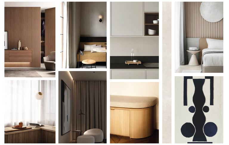 Le coté brut et épuré du sol en béton ciré sera réchauffé par le bois, que l'on retrouvera au niveau de tous les meubles créés sur mesures. Une douce palette de tons neutres, réhaussé par des petites touches de couleurs en matières, assurera une ambiance apaisante mais de caractère.