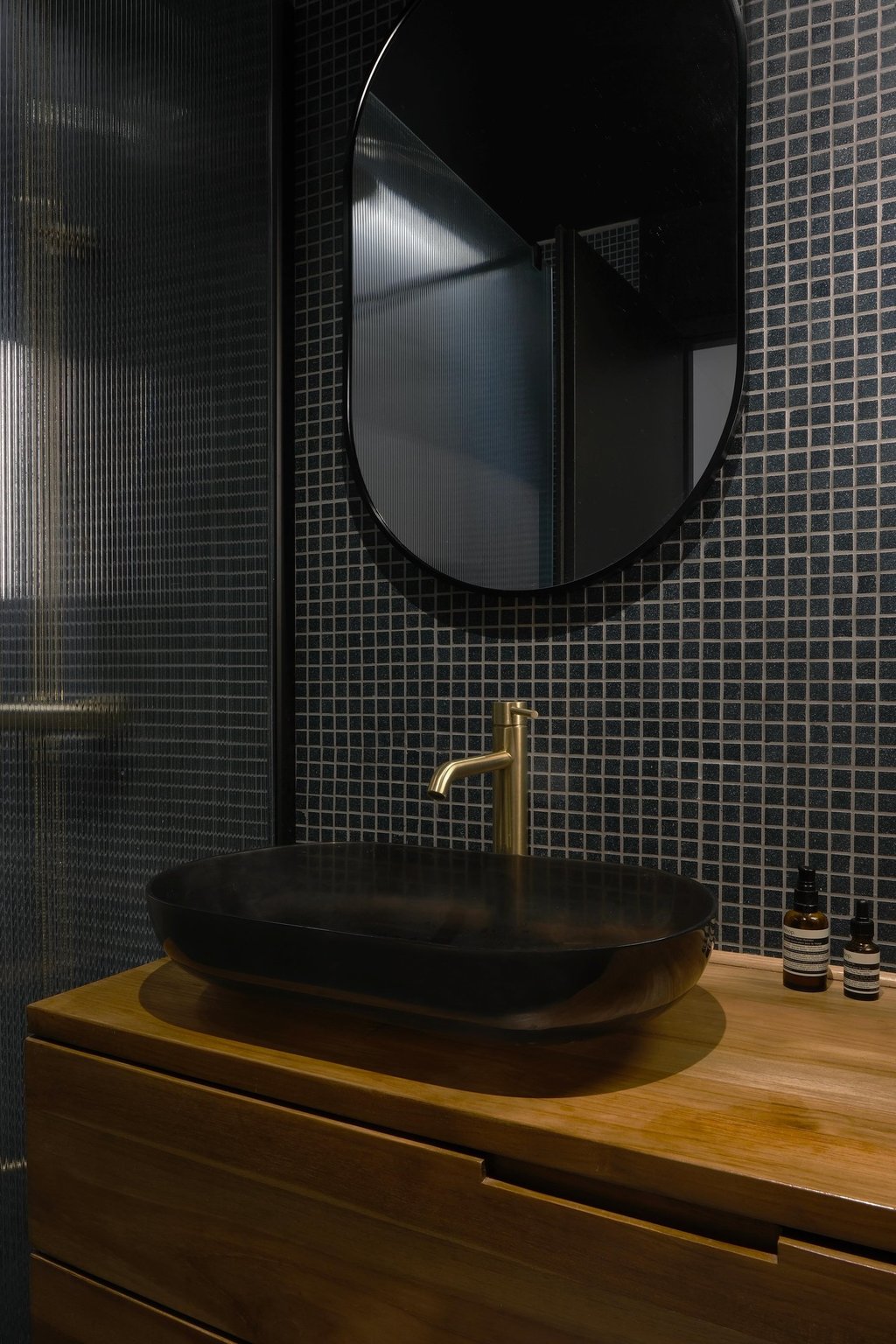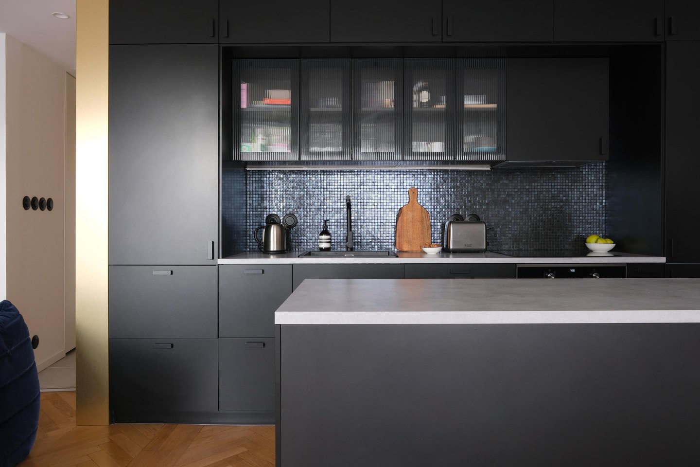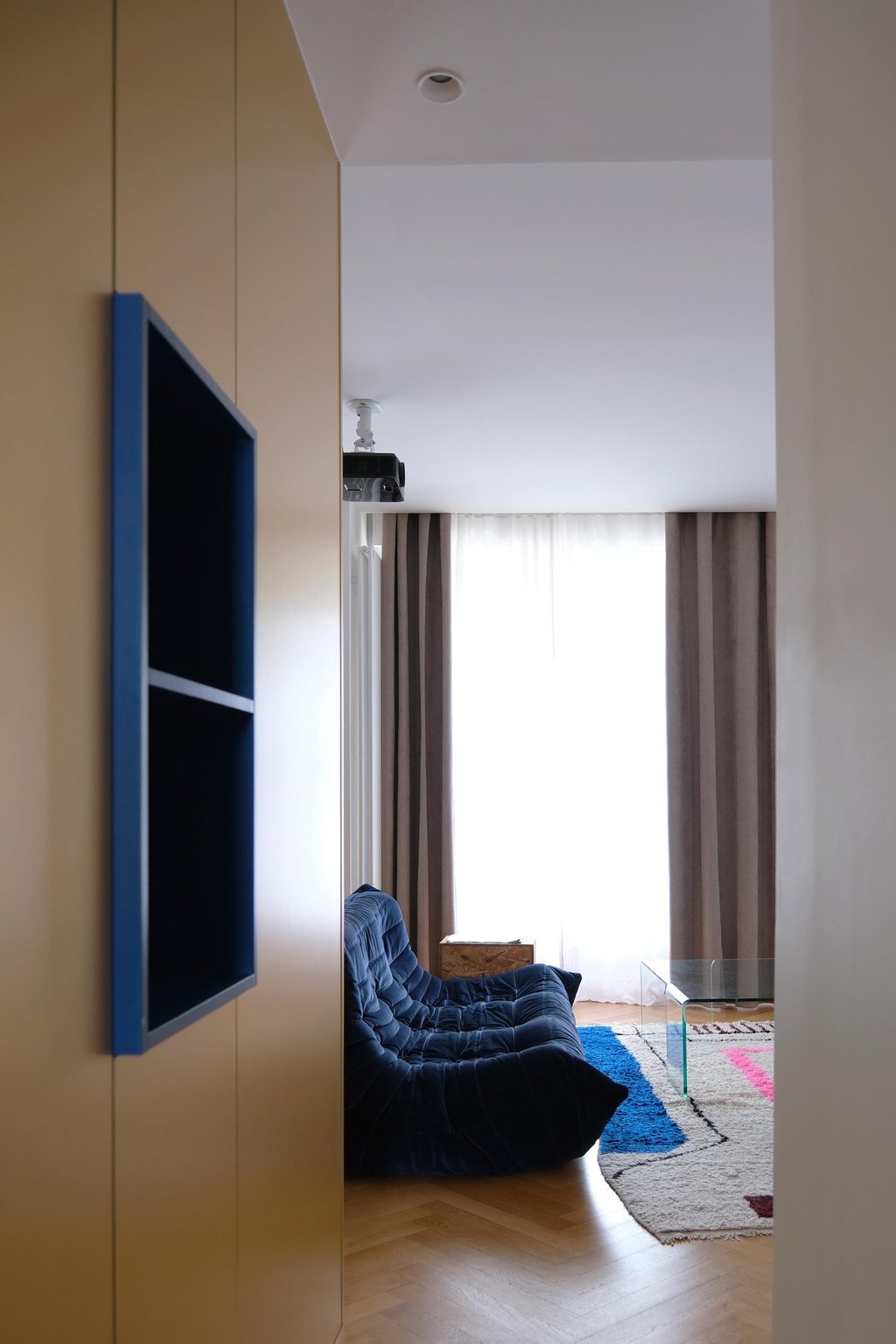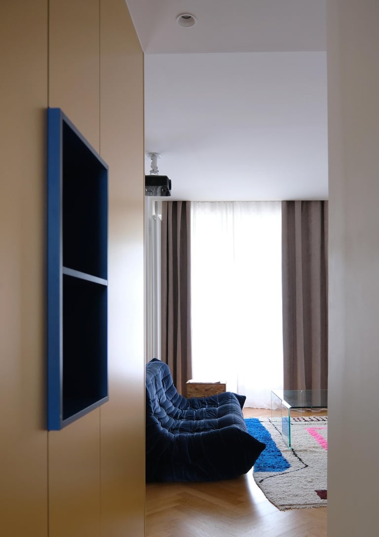 Au cœur de cet espace, tout repose sur un cube central doré, véritable noyau fonctionnel, où se dissimulent la cuisine, le rangement de l’entrée, une penderie, un espace pour les chaussures, et même la salle de bain. Ce cube s’articule autour de ce point focal, optimisant l’agencement tout en ajoutant une dimension esthétique unique.