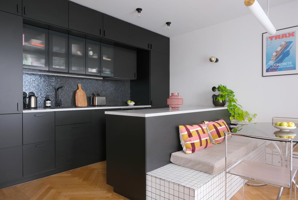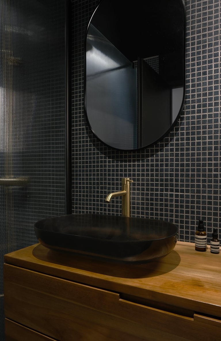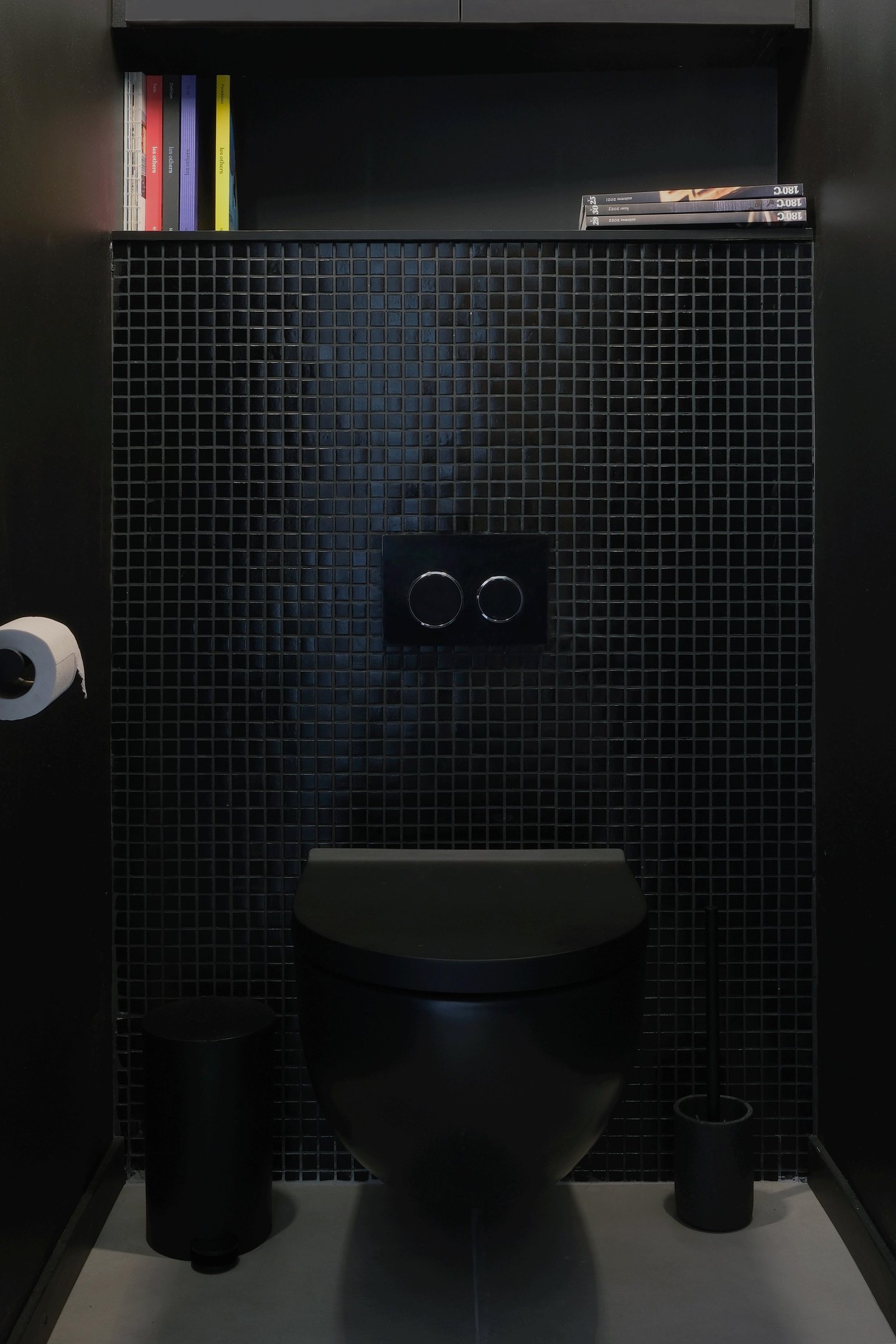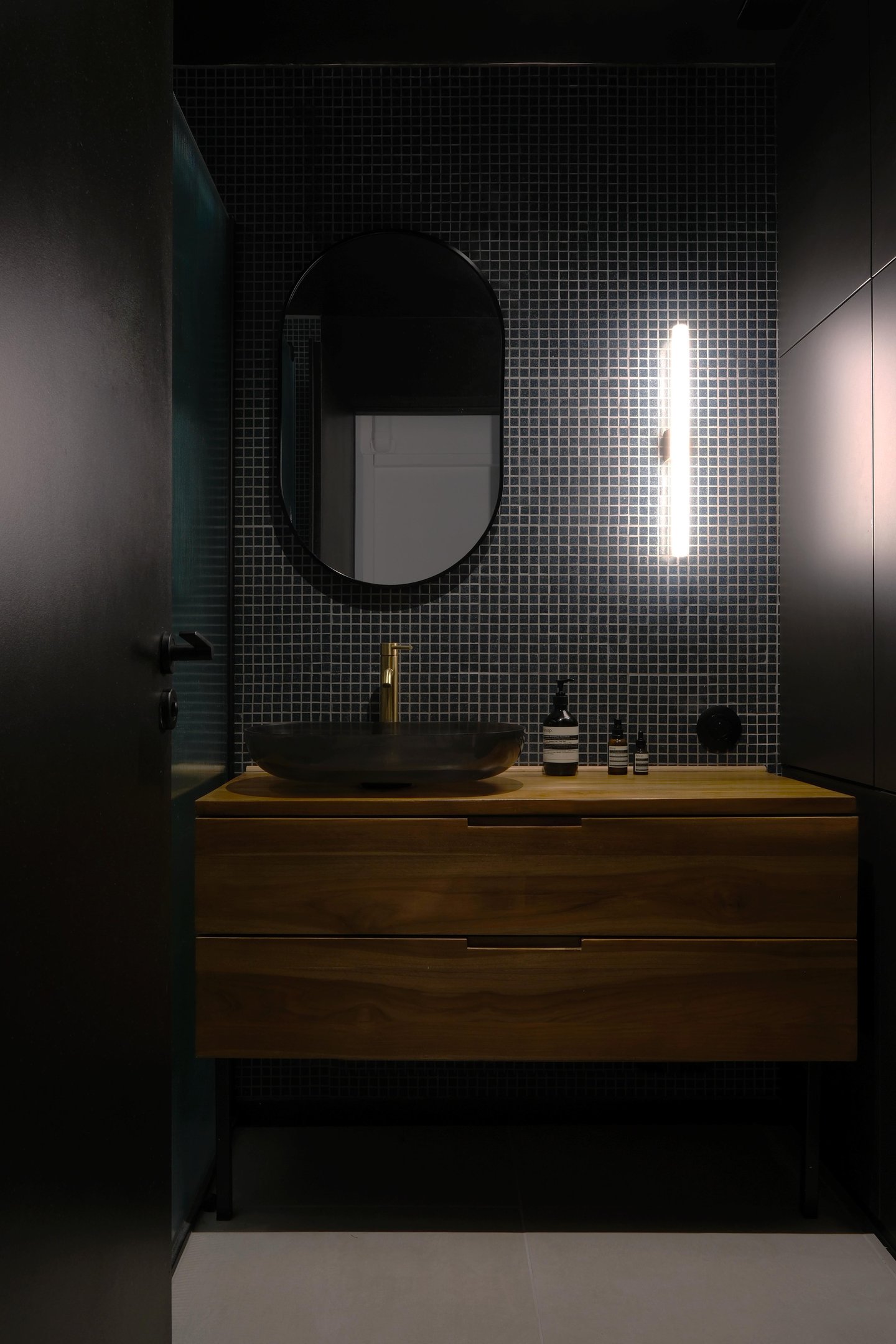 Au cœur de cet espace, tout repose sur un cube central doré, véritable noyau fonctionnel, où se dissimulent la cuisine, le rangement de l’entrée, une penderie, un espace pour les chaussures, et même la salle de bain. Ce cube s’articule autour de ce point focal, optimisant l’agencement tout en ajoutant une dimension esthétique unique.