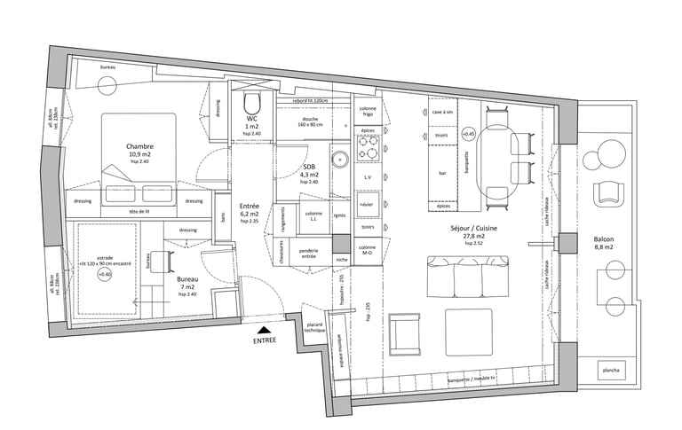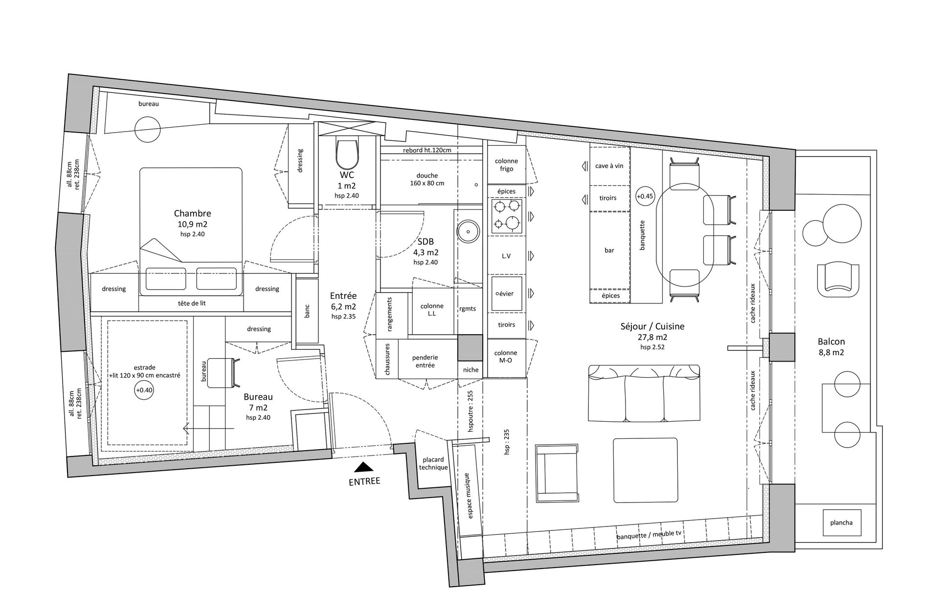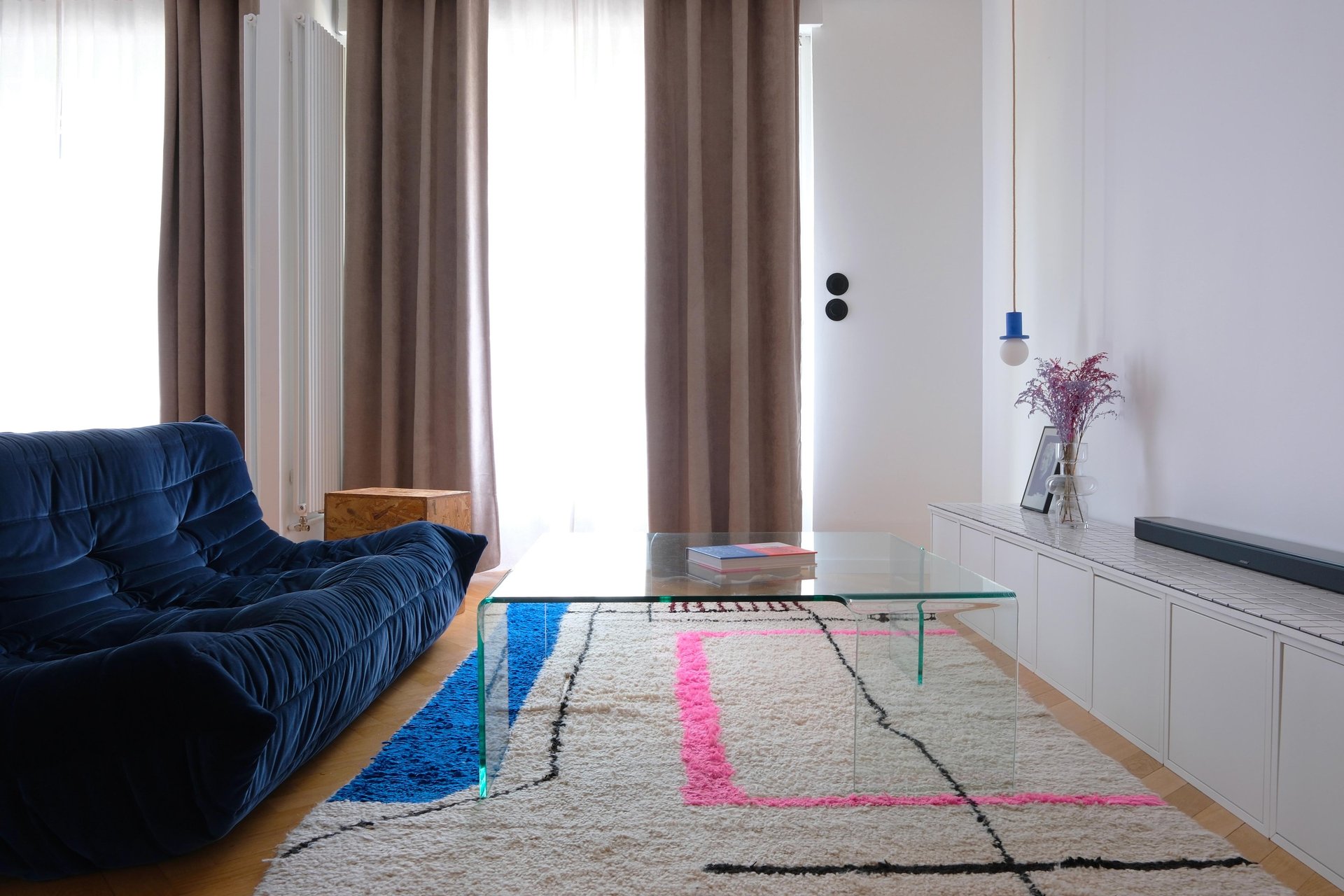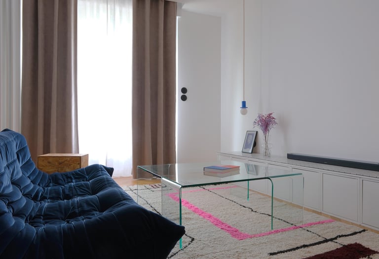 Le projet vise à créer un espace versatile et modulable qui s’adapte aux différents moments de la journée, avec deux chambres. Dans un contexte de vie par intermittence, où le télétravail et les voyages sont fréquents, l’appartement doit offrir un cocon apaisant et réconfortant, avec des matériaux doux et une lumière agréable.