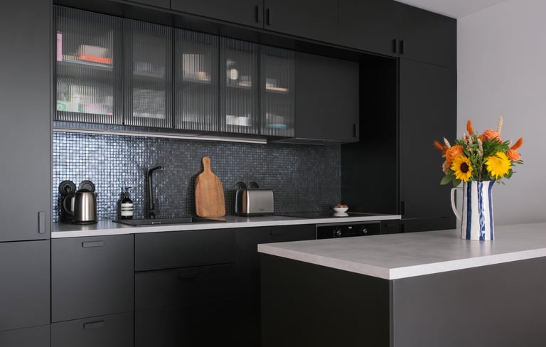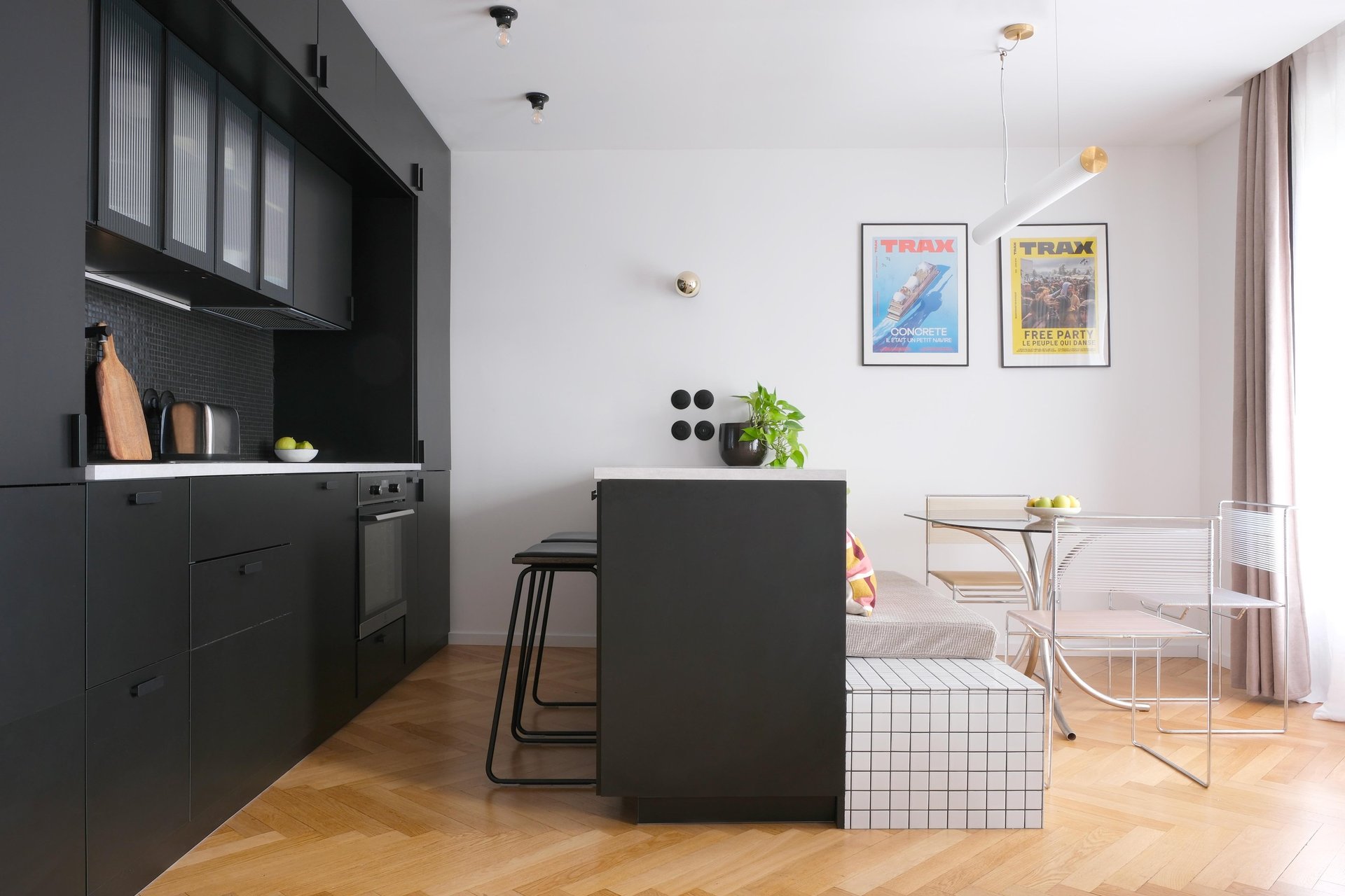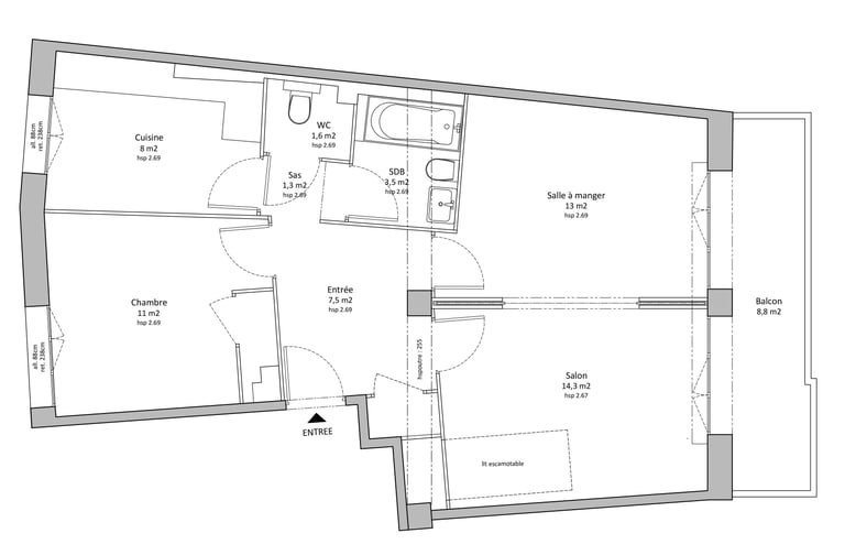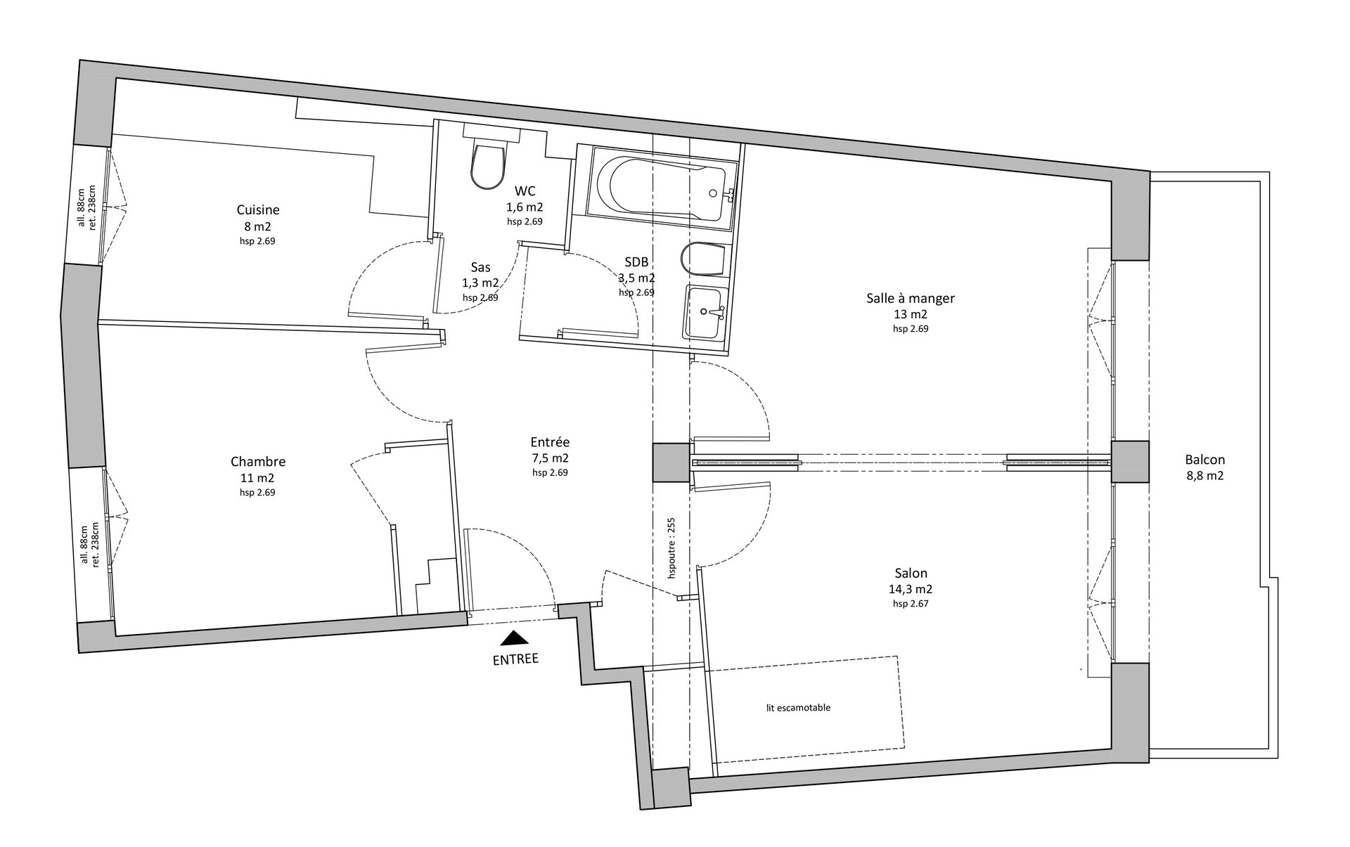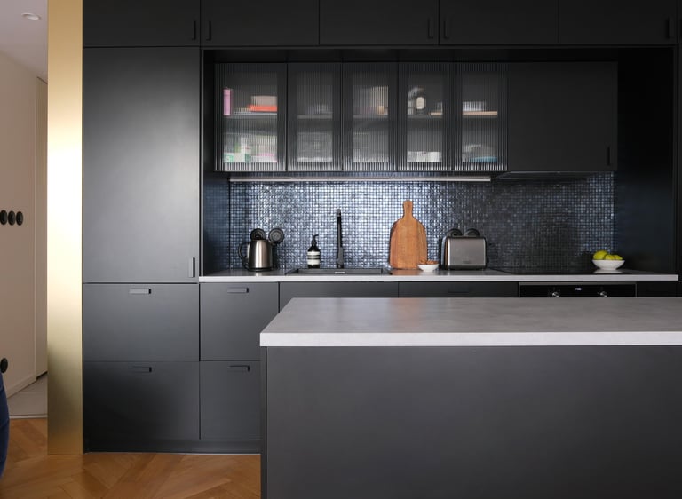Le projet vise à créer un espace versatile et modulable qui s’adapte aux différents moments de la journée, avec deux chambres. Dans un contexte de vie par intermittence, où le télétravail et les voyages sont fréquents, l’appartement doit offrir un cocon apaisant et réconfortant, avec des matériaux doux et une lumière agréable.