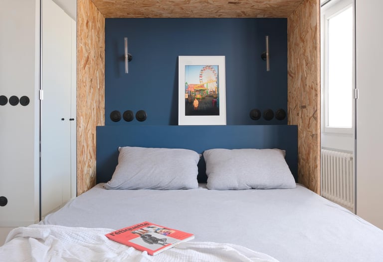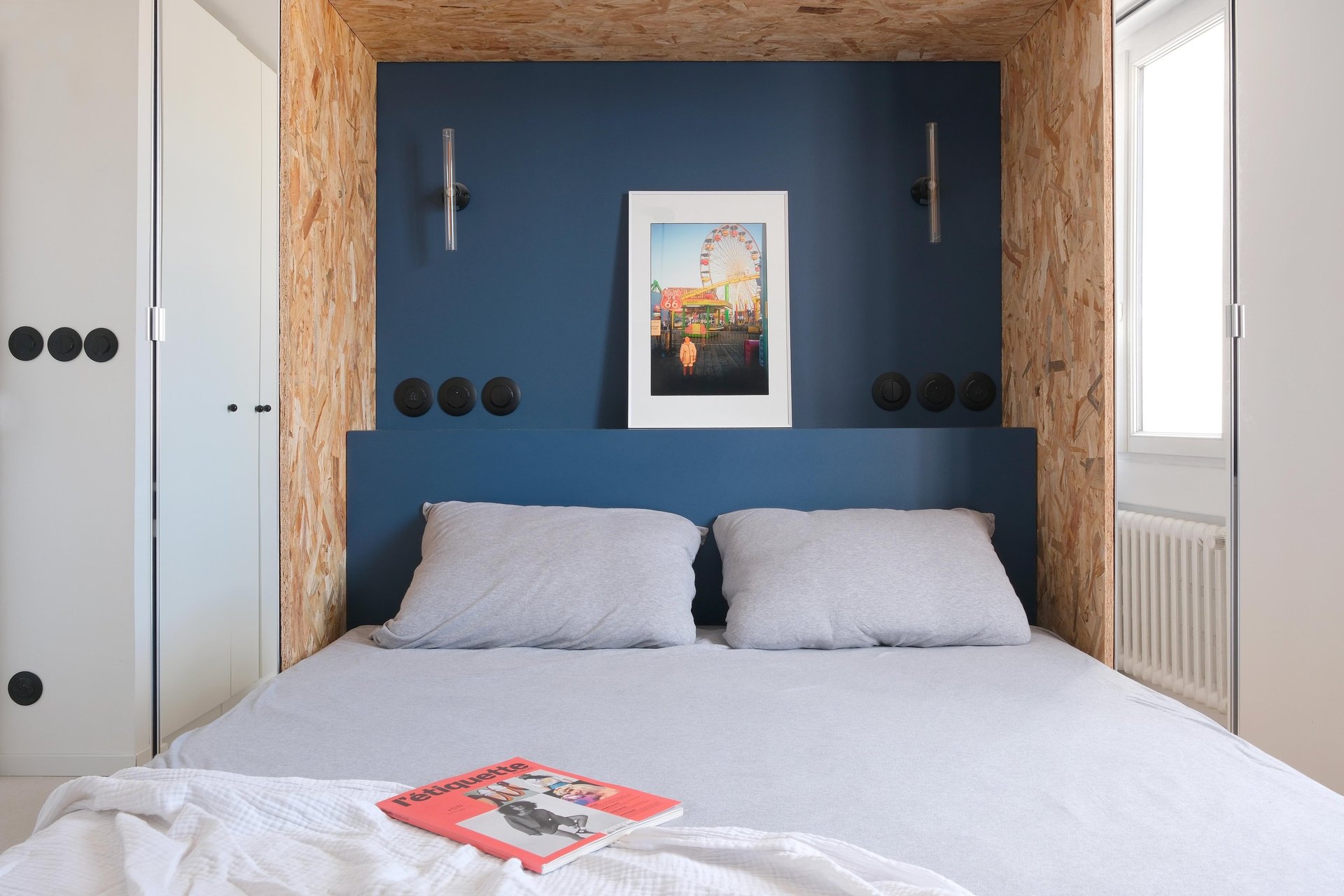 Le design met en valeur un contraste entre des matériaux bruts comme le béton et l’OSB, et des éléments doux et réconfortants tels que le velours et la moquette. Cette alchimie crée une atmosphère unique et chaleureuse, où chaque détail contribue à l’esprit enchanteur du lieu. Le minimalisme garantit que rien ne traîne, tout en favorisant un environnement serein. L’accent est également mis sur l’écologie avec l’utilisation de matériaux durables, et une isolation phonique renforcée assure un havre de paix.